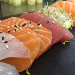 2 nigiris sushis thon, 2 nigiris sushis saumon et sashimis "2 thon, 2 saumon, 2 daurade". 10 pièces.