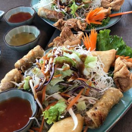 6 California crevette avocat, 6 crispy roll thon cuit avocat cheese et 6 création papa poulet avocat mayo spicy oignons frits. 18 pièces. Servi avec accompagnement au choix.
